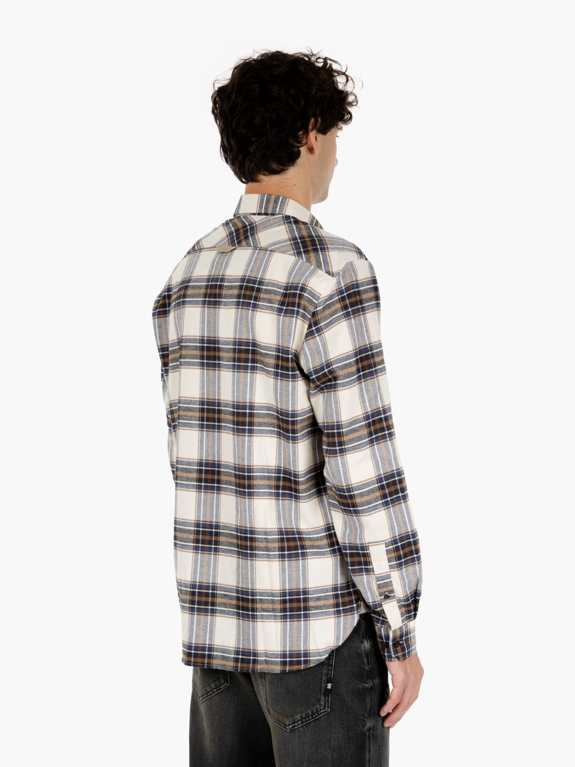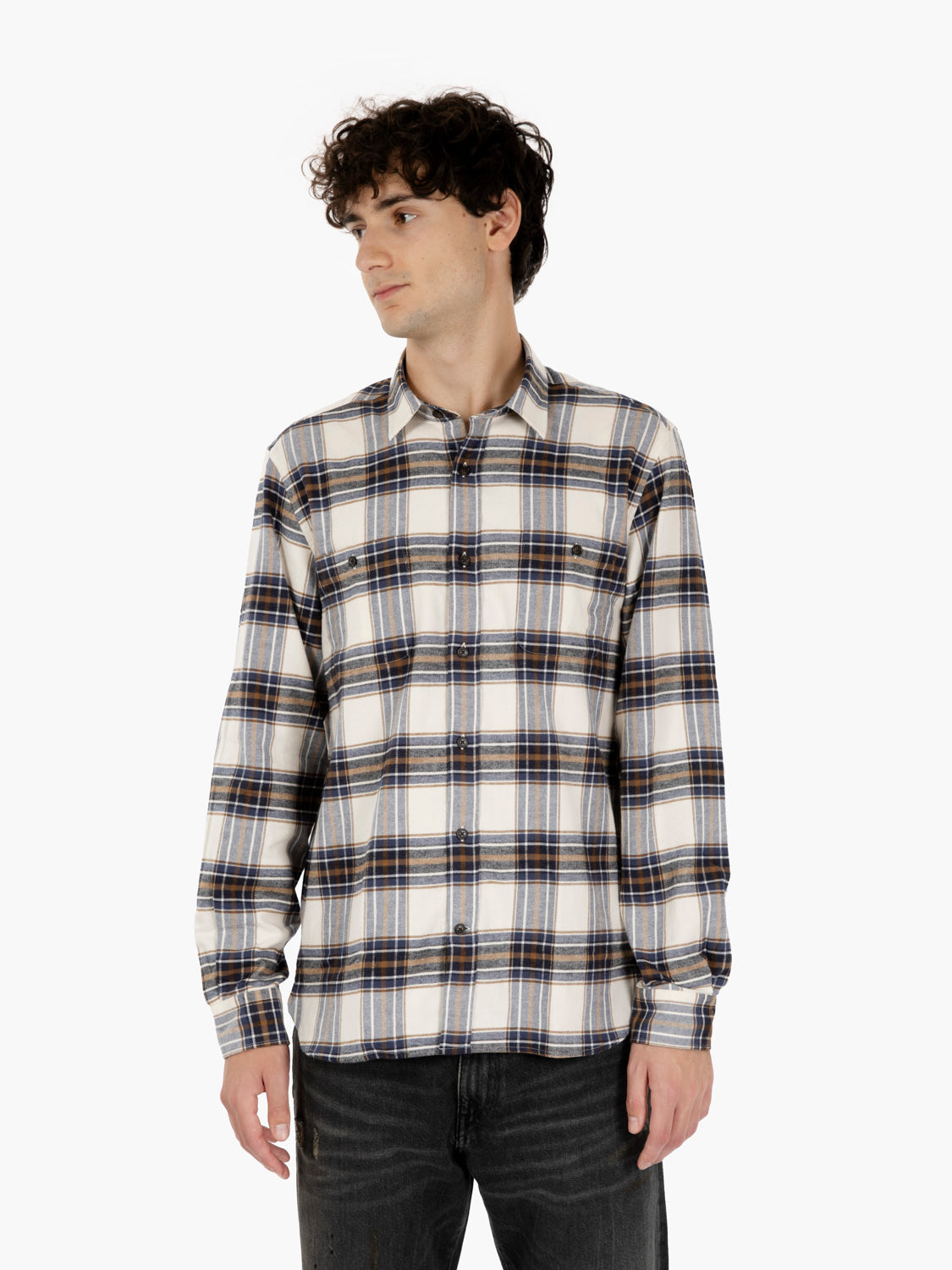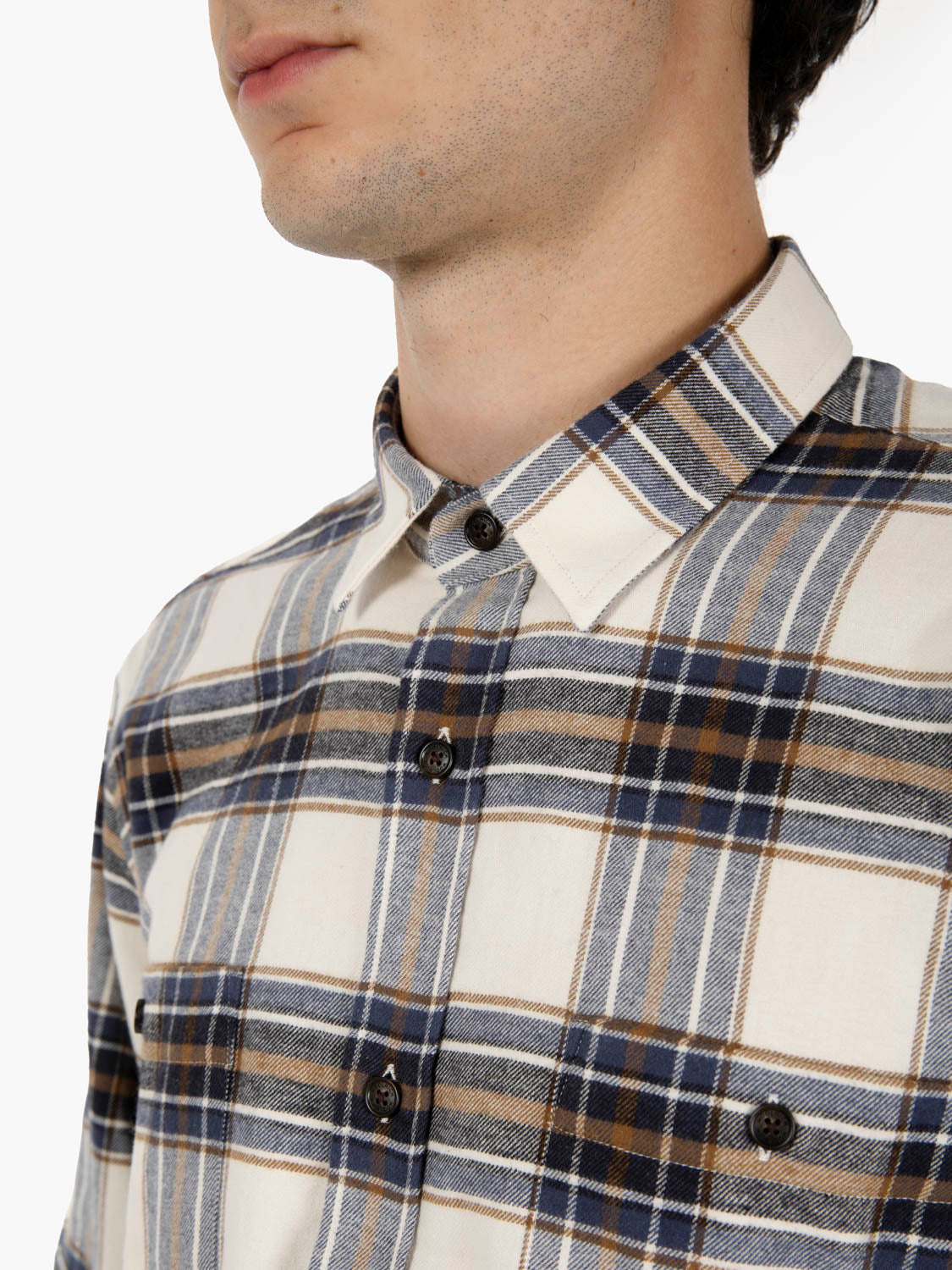 Camicia in flanella di puro cotone con motivo a quadri firmata Woolrich. A completare il design, il gancetto posteriore logato e l'etichetta sul fondo dell'abbottonatura.