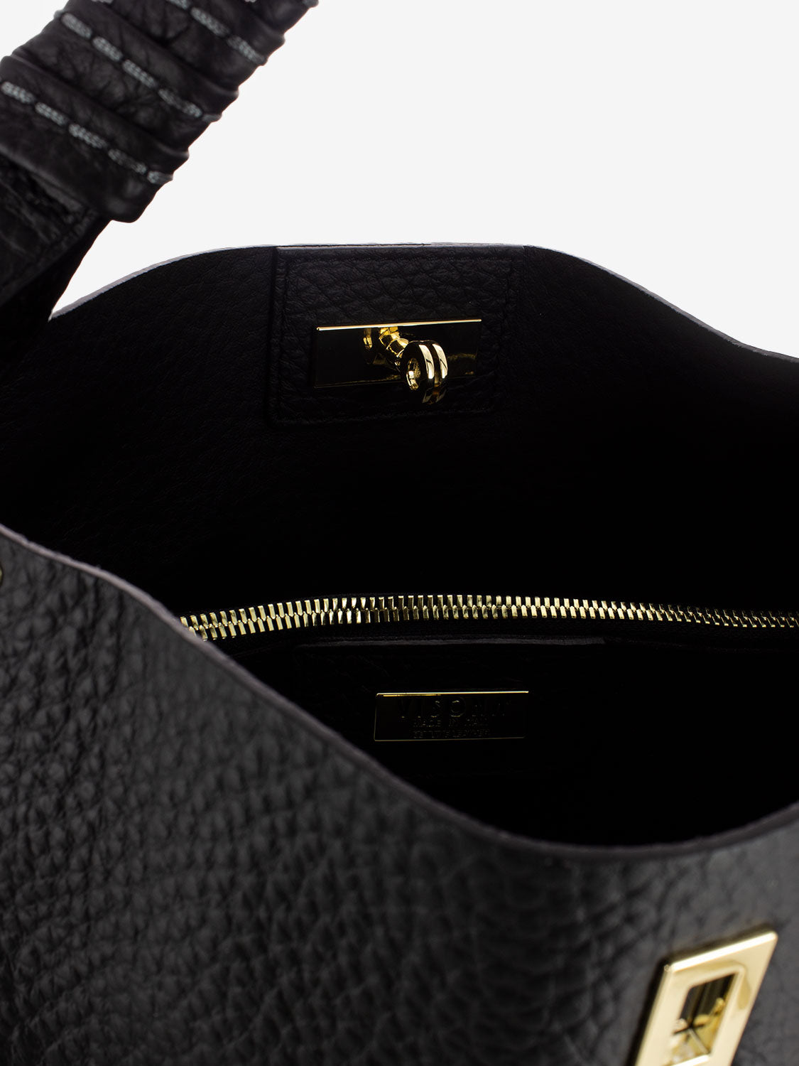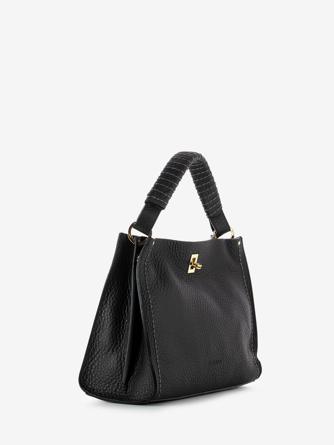 Borsa a mano in pelle martellata cuciture a vista firmata Plinio Visonà. Può essere portata a mano o a tracolla.