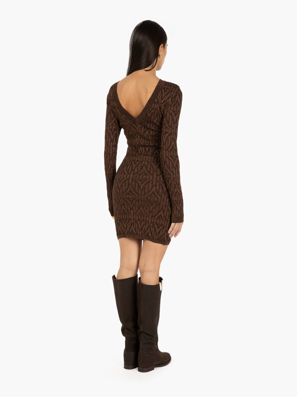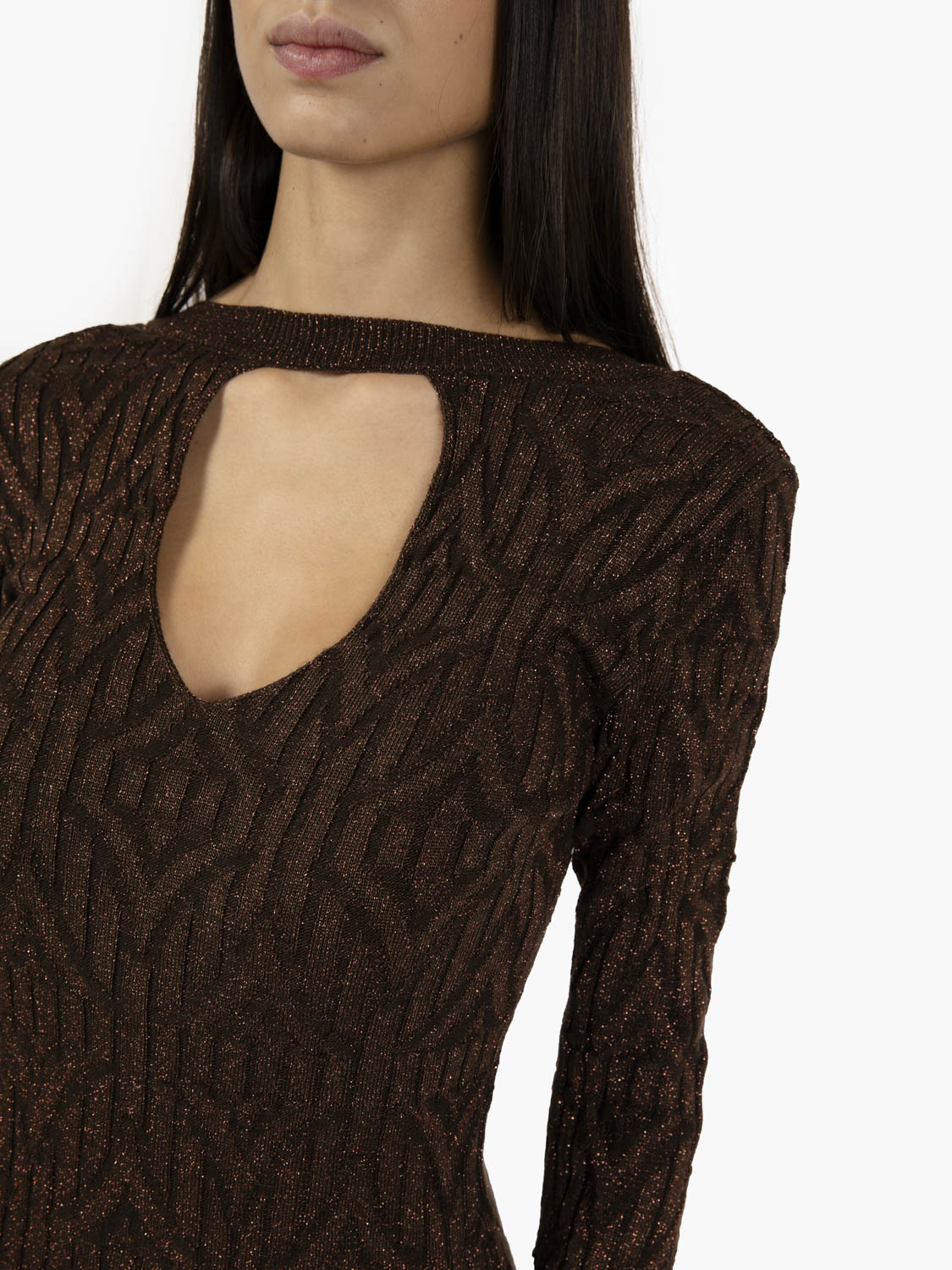 Mini dress in glittery ribbed knit with porthole neckline at the front and V-neck at the back.