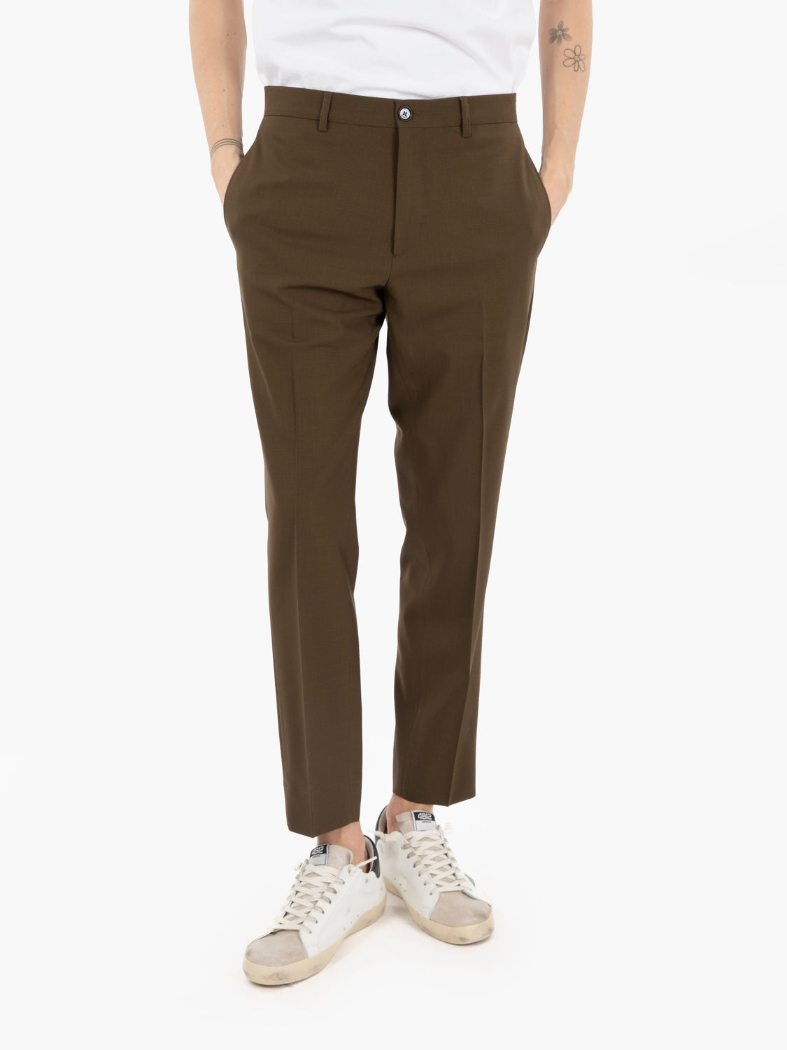 High waist, zip and button fastening.