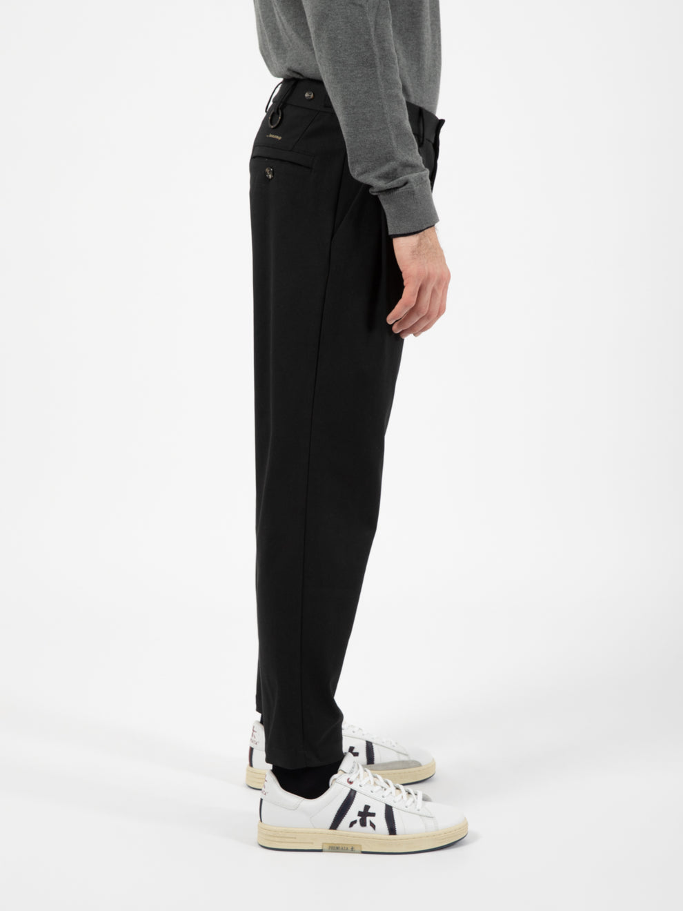 Front American pockets with pleats, rear welt pockets , one of which has a button.