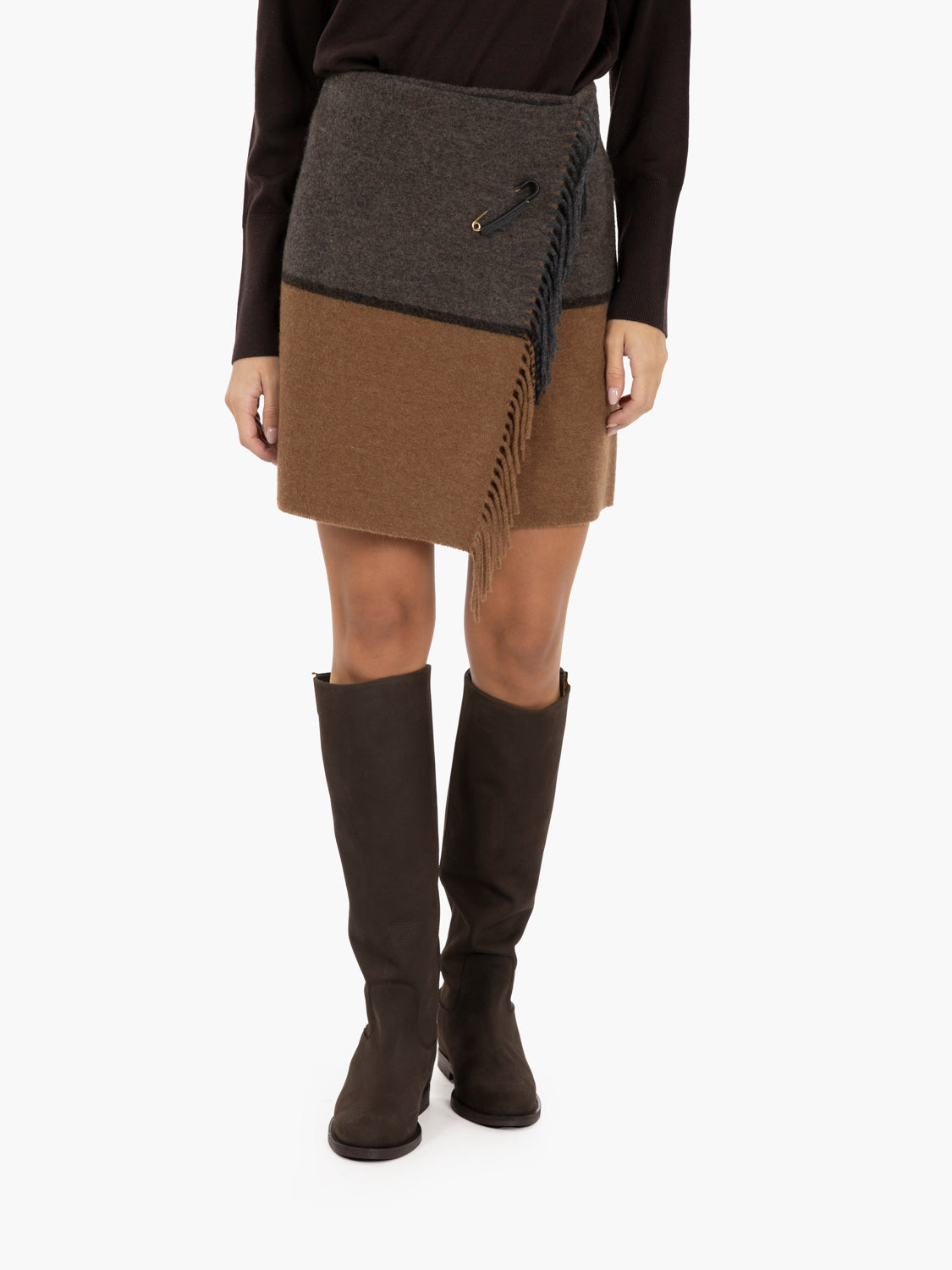 Cloth miniskirt with wrap closure and side fringes.