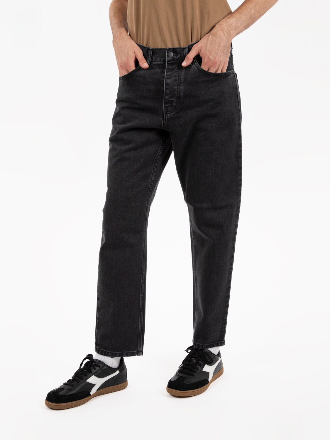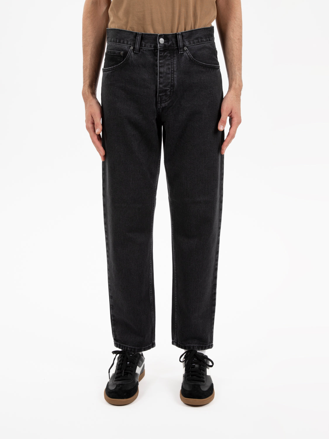 Relaxed tapered fit, regular waist.