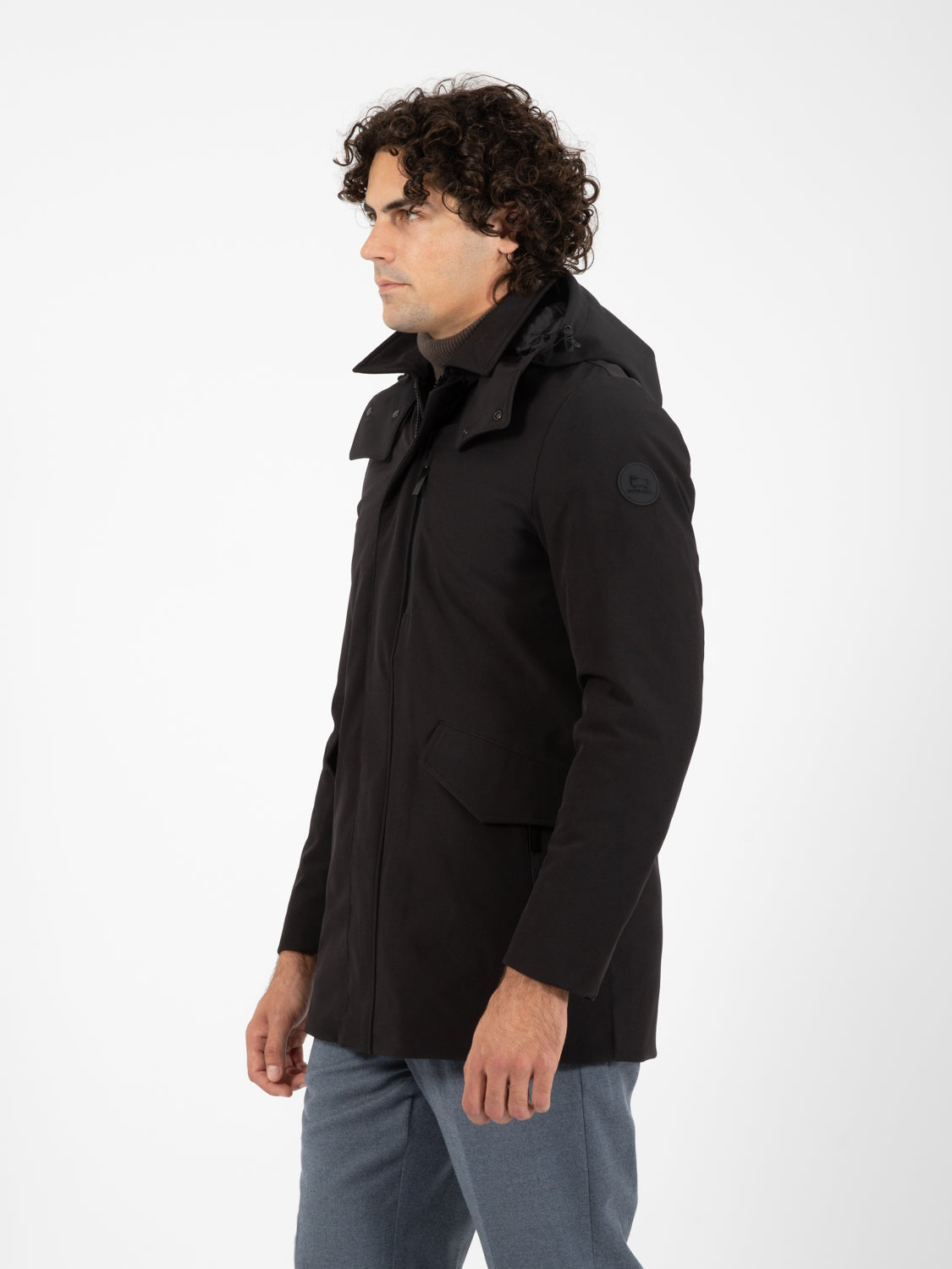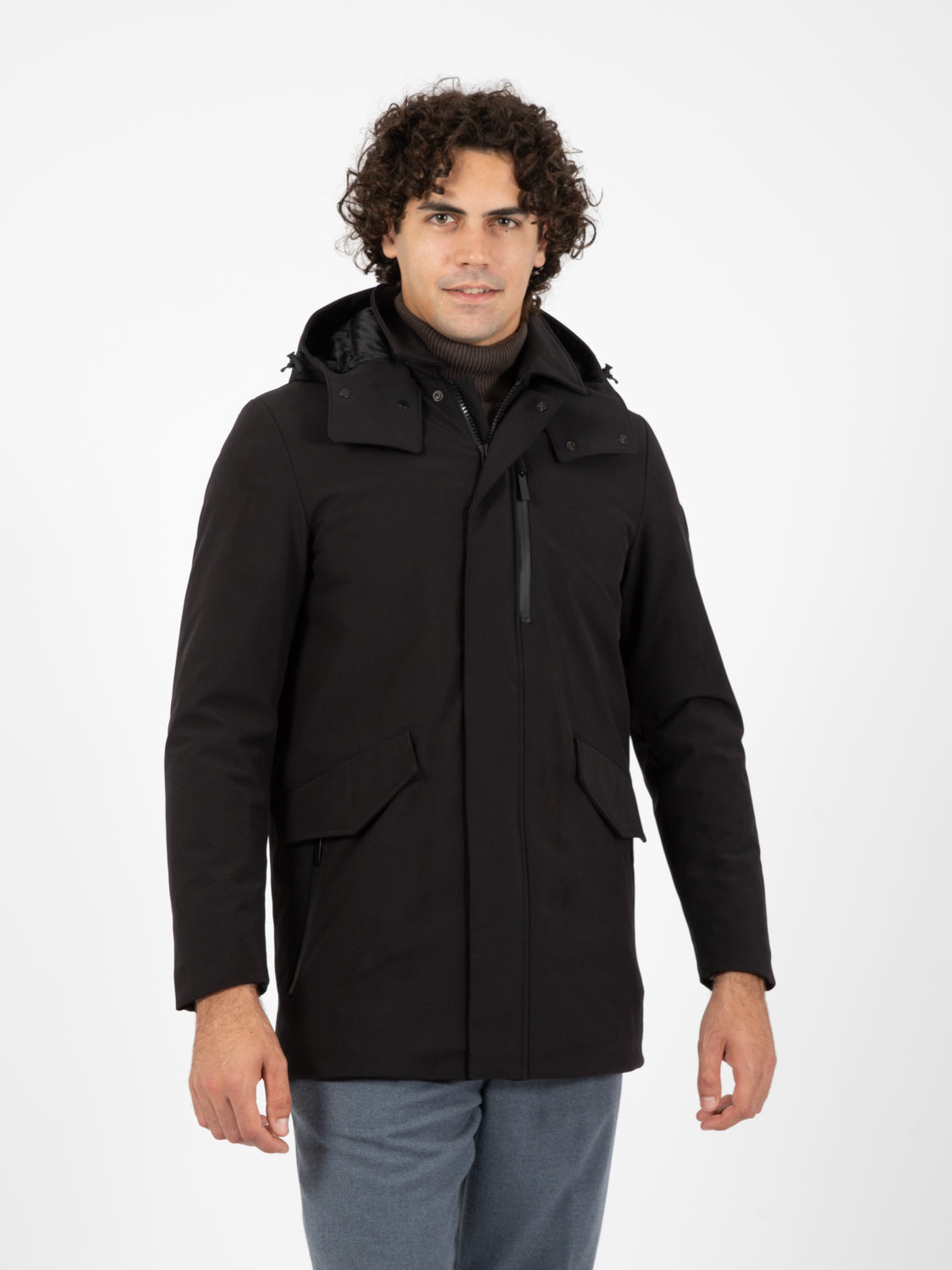 High collar with wide hood, sleeves with elastic ribbed cuffs.