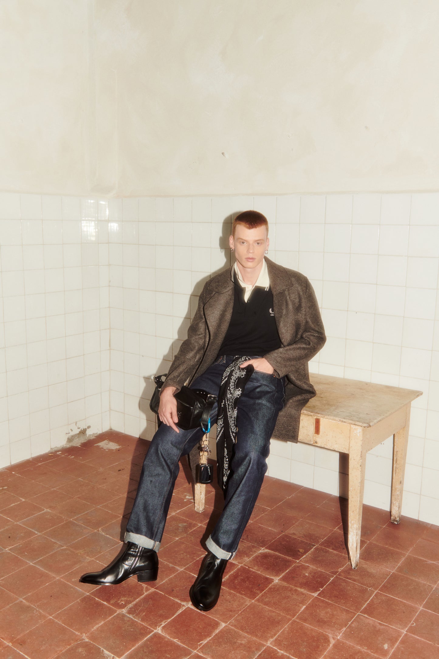 Un look che sa di periferia inglese: polo Fred Perry x Comme des Garçons Shirt infilata nel denim grezzo Levi’s, cappotto lungo che sfiora l’asfalto, bandana e tracolla utility come dettagli street. Stivaletti a punta in pelle a chiudere un look che mescola ribellione e identità.