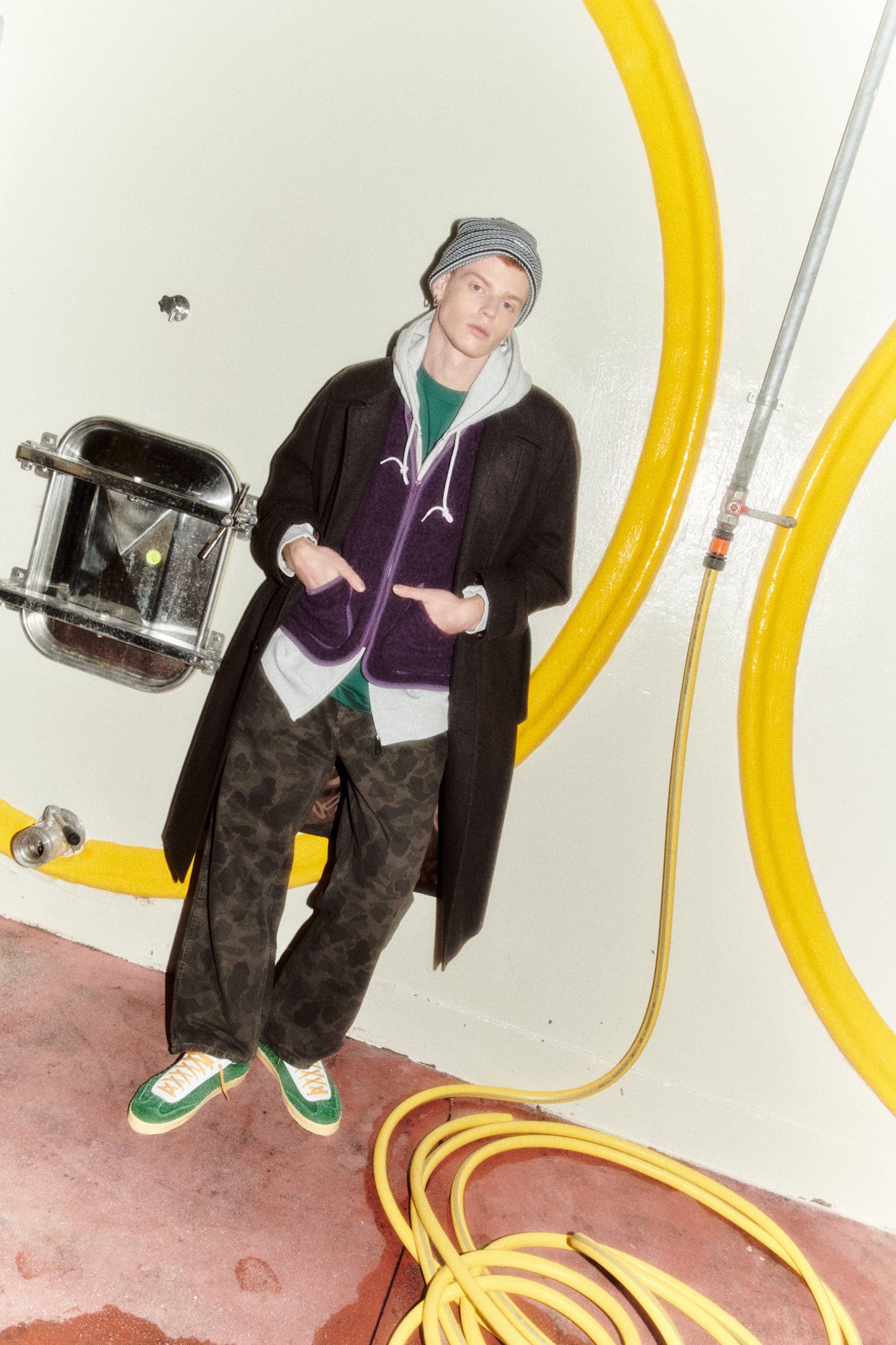 Un layering di colori e texture che rendono il look contemporaneo ed adatto anche alla stagione fredda, arricchito da accessori streetwear come le sneakers Stacy e la tote bag Carhartt Wip, per un equilibrio tra comfort urbano e stile sofisticato.