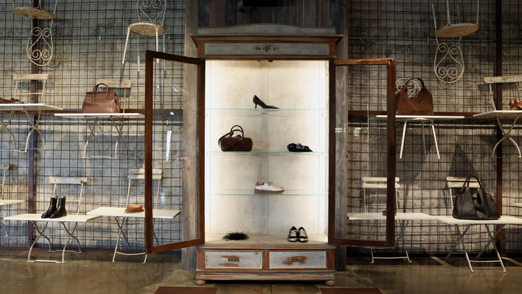 Qui il riuso creativo raggiunge la sua massima espressione visiva: display inaspettati trasformano scarti industriali in scenografie che esaltano sneakers iconiche, calzature in cuoio d’autore, abbigliamento ricercato e accessori di alta gamma inseriti in una cornice di sedie volanti.